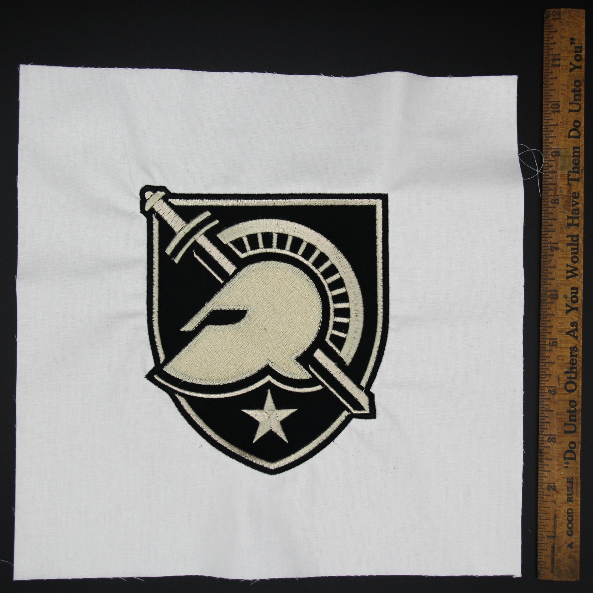 Beautiful 10 inch Embroidered West Point Military Academy Quilt Block. These are exactly the same blocks I use to make quilts and throw pillows you see on this site. You can too. These logos are embroidered on white high quality quilting fabric. Most of them have 20,000 to 30,000 stitches and take over two hours to stitch out. If you look at the blocks on the quilts you will be able to have a better understanding of the size of the embroidery on the block. Satisfaction guaranteed.