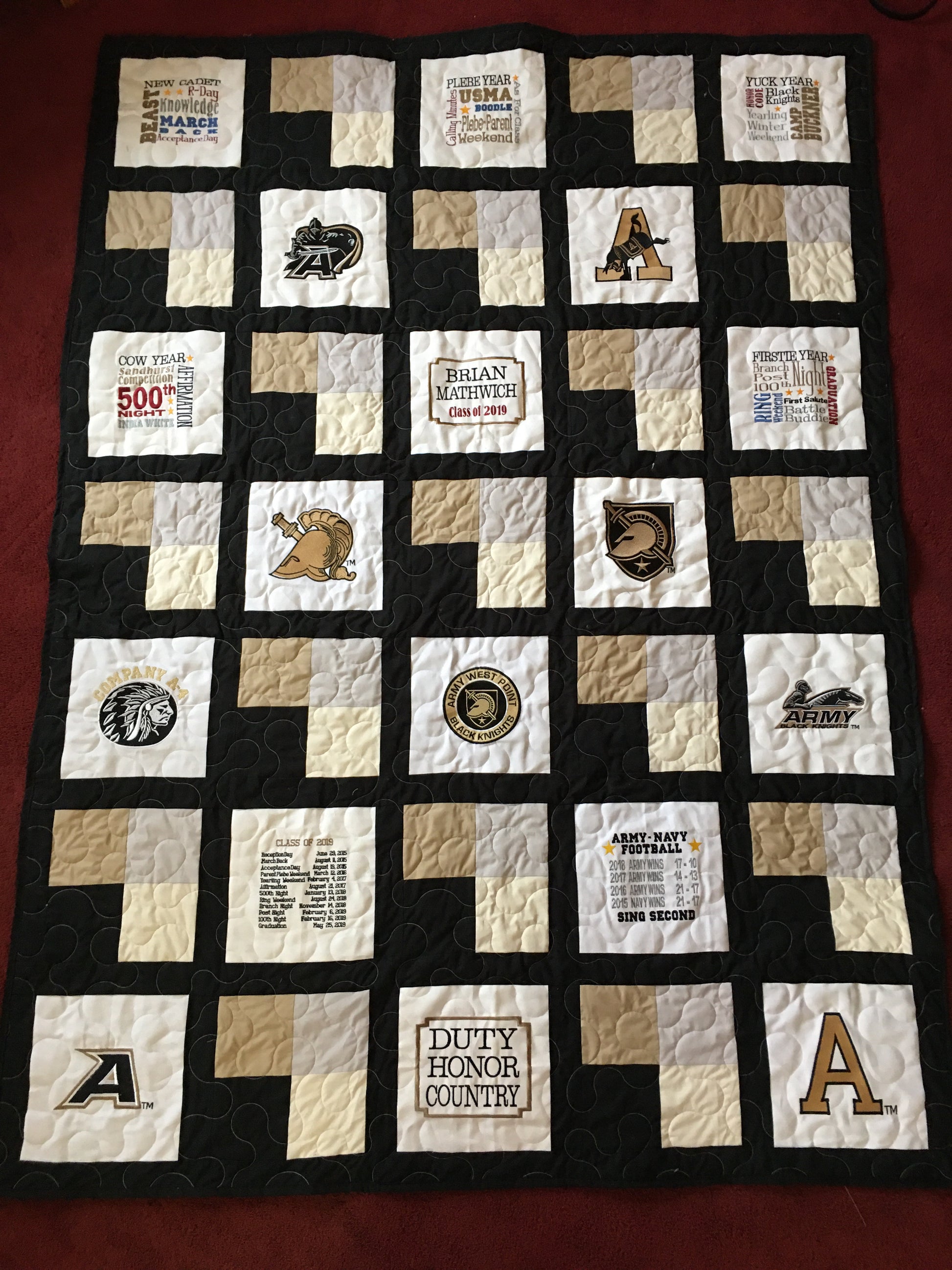 Please look at my other items. You will see personalized quilt blocks. I can do most anything you might want. These are great for homemade gifts for anyone close to a West Point cadet including: Your son or daughter, their roommate, Mom, Dad, Grandmother, Grandfather, someone who helped your cadet, brother, sister, girlfriend or boyfriend.
