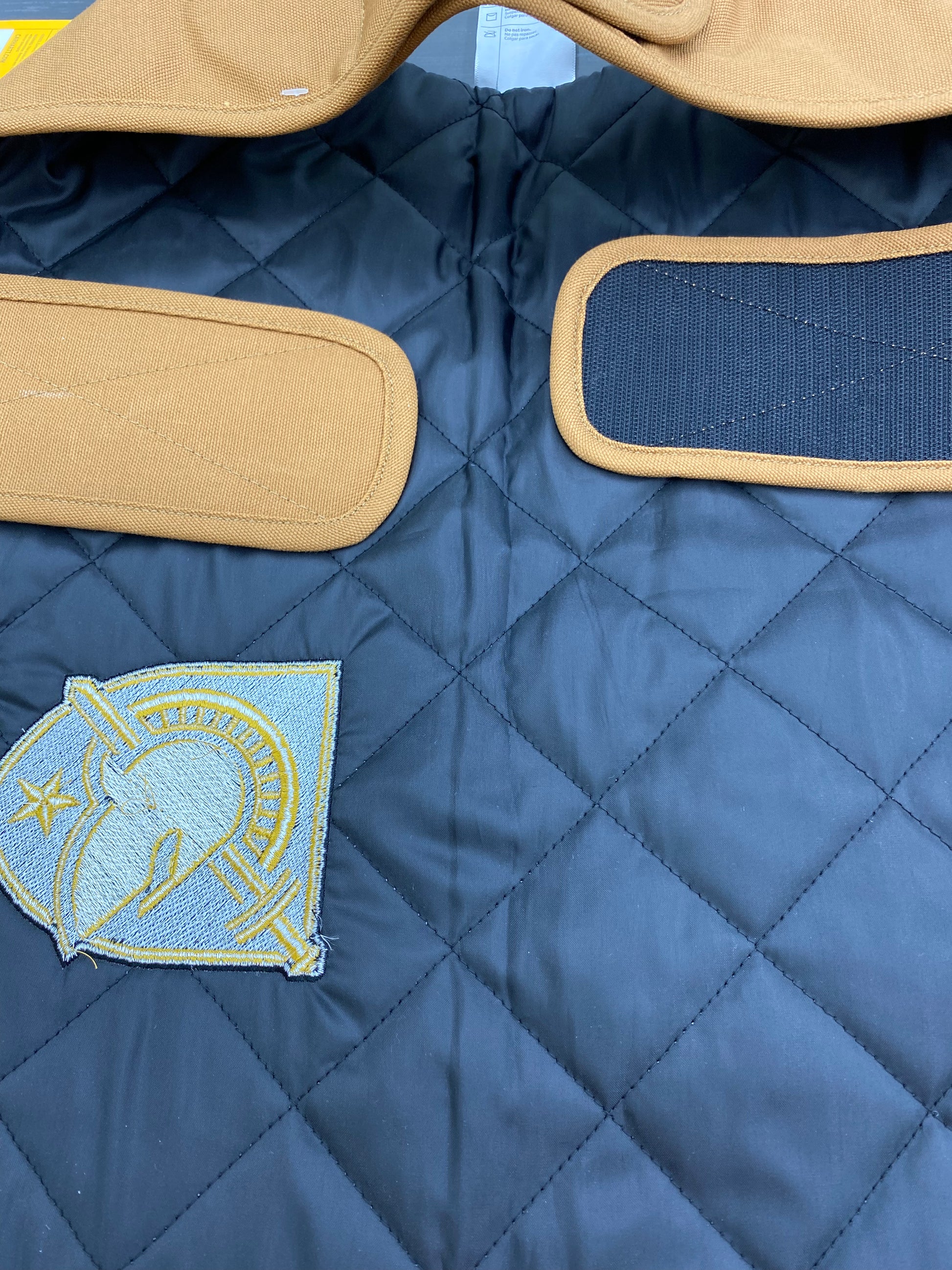 • The quilted liner is a durable nylon with polyester batting for added warmth. Improved tabs at the neck and chest make it simple to take on and off